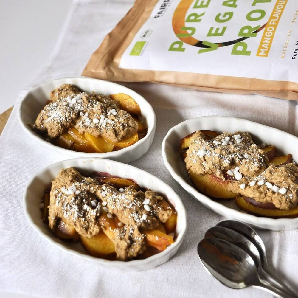 - Alle trockenen Zutaten bis auf die Pfirsiche miteinander vermengen